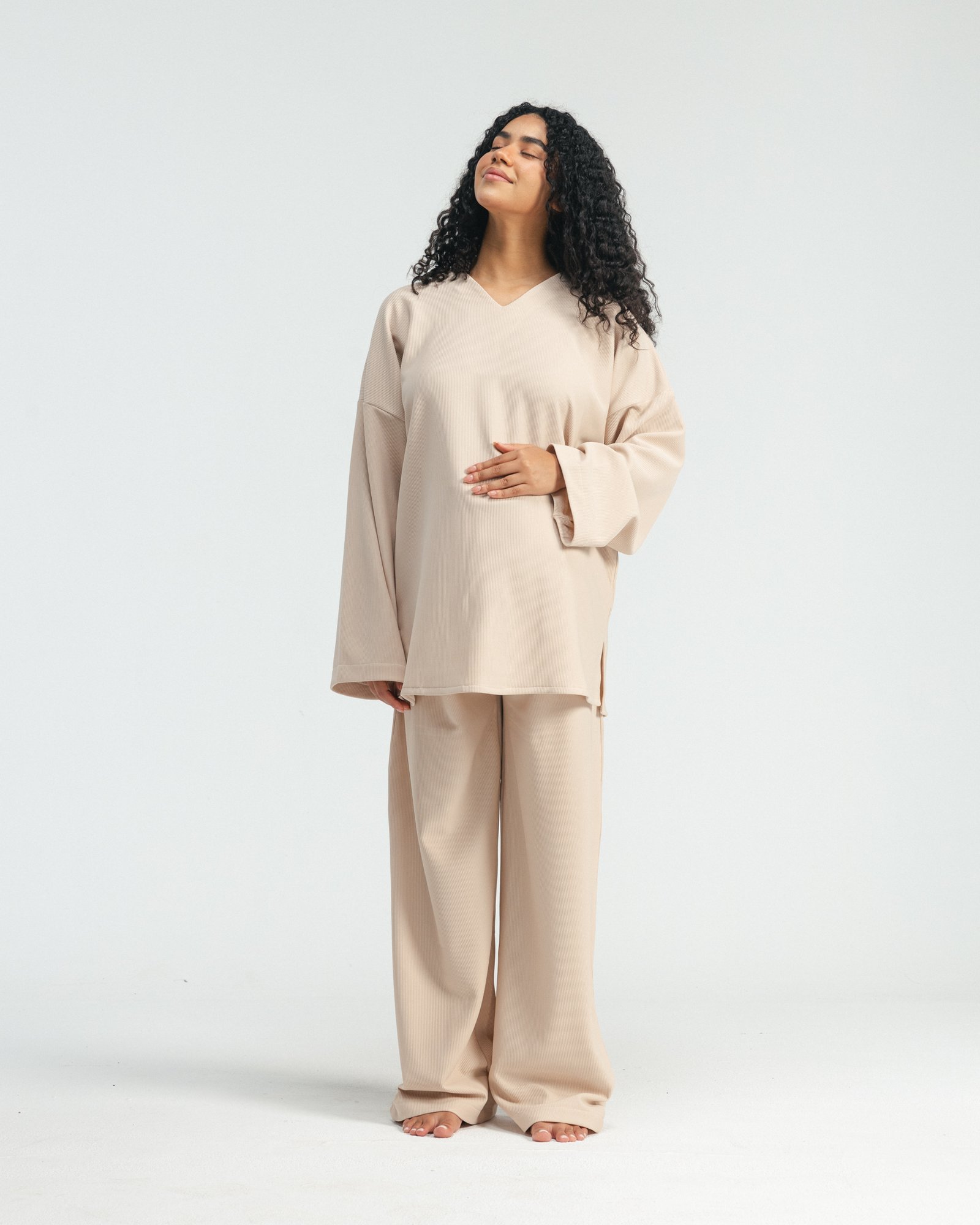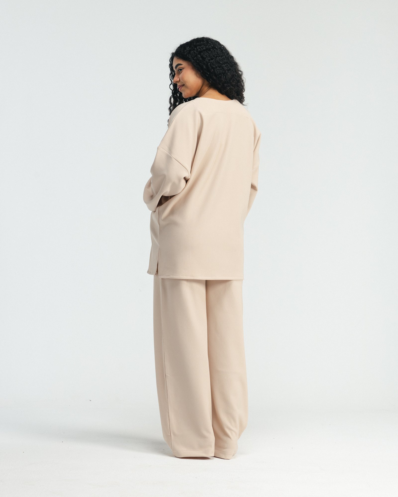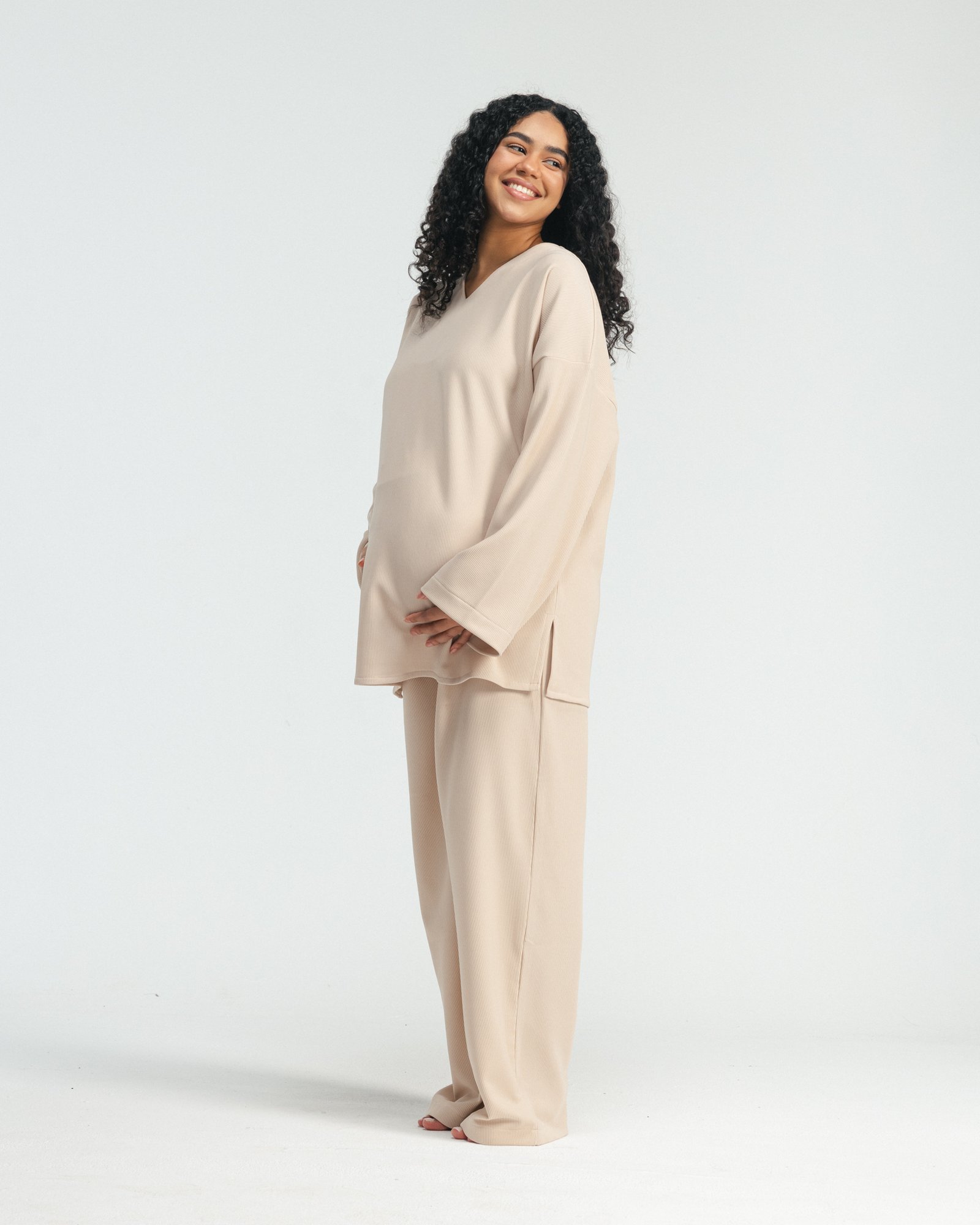 • 2-piece set: Relaxed-fit V-neck top + wide-leg pants