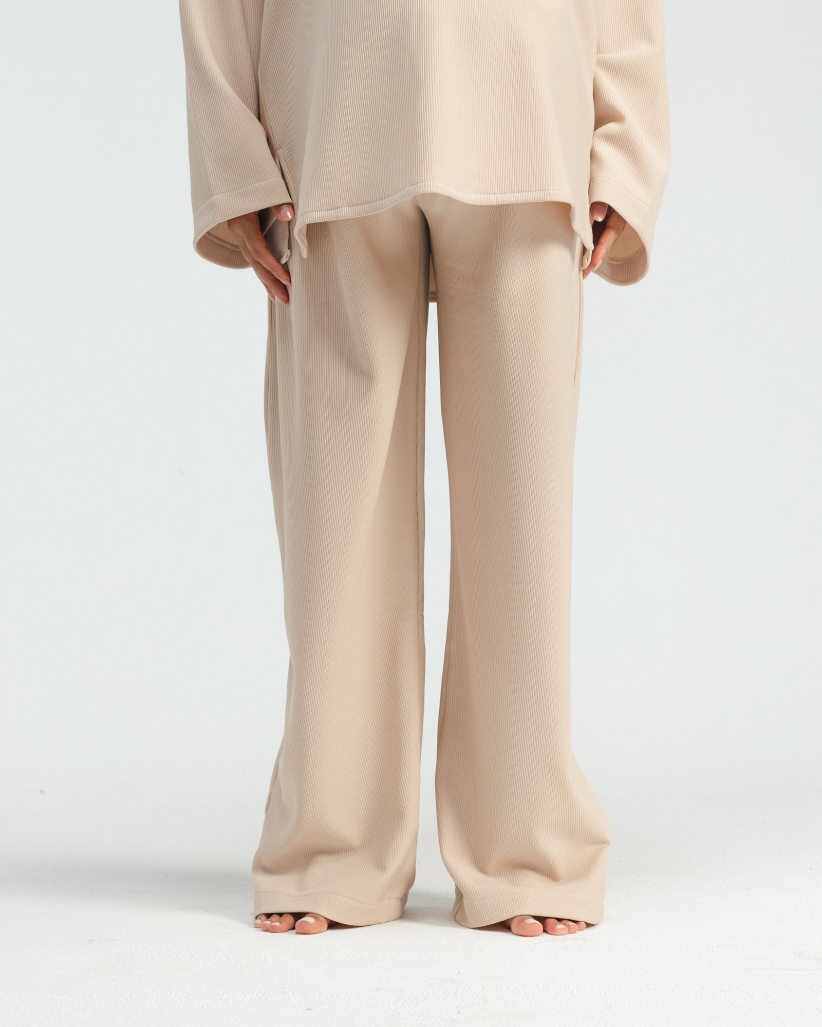 • Wide-leg silhouette: elevated lounge-to-leave vibe